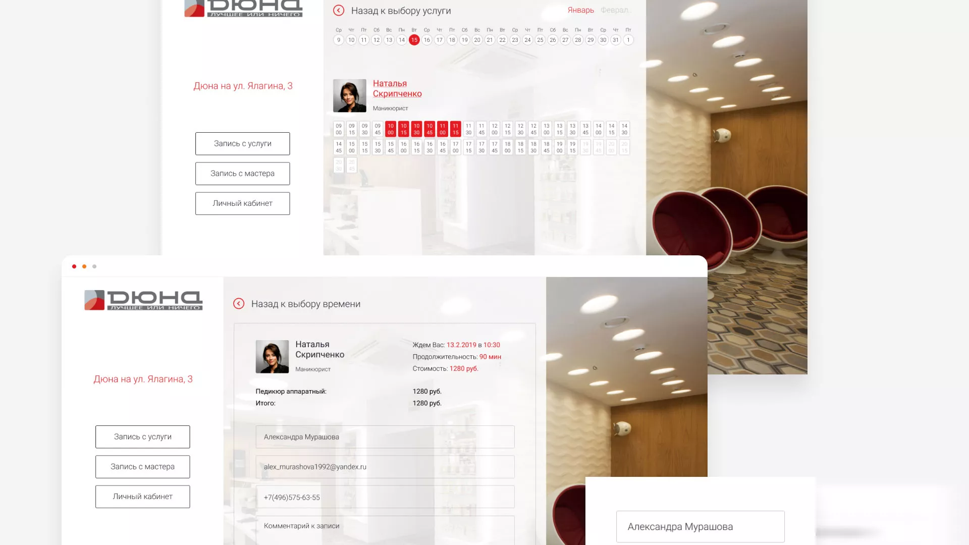 В разделе «Личный кабинет» содержатся все текущие записи в салоны красоты в Северске, с возможностью их отмены. Также, здесь можно редактировать свои персональные данные, ознакомиться с историей записей и видеть бонусы и акции салонов красоты.